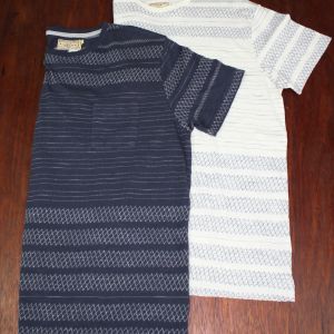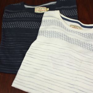 We’ve produced our very own ‘Jewel’ for spring! Available in two colour options, Navy with Grey detail or Cream with Navy detail. The contrast texture in this knitted jacquard t-shirt is a stylishly smart option for the warmer months ahead. This pattern is created by knitting the contrast yarn through base fabric creating a contemporary everyday look.